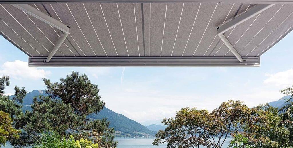 Store à projection avec bras latéraux permettant de réguler la lumière et la chaleur selon ses préférences afin de rendre son intérieur plus confortable.